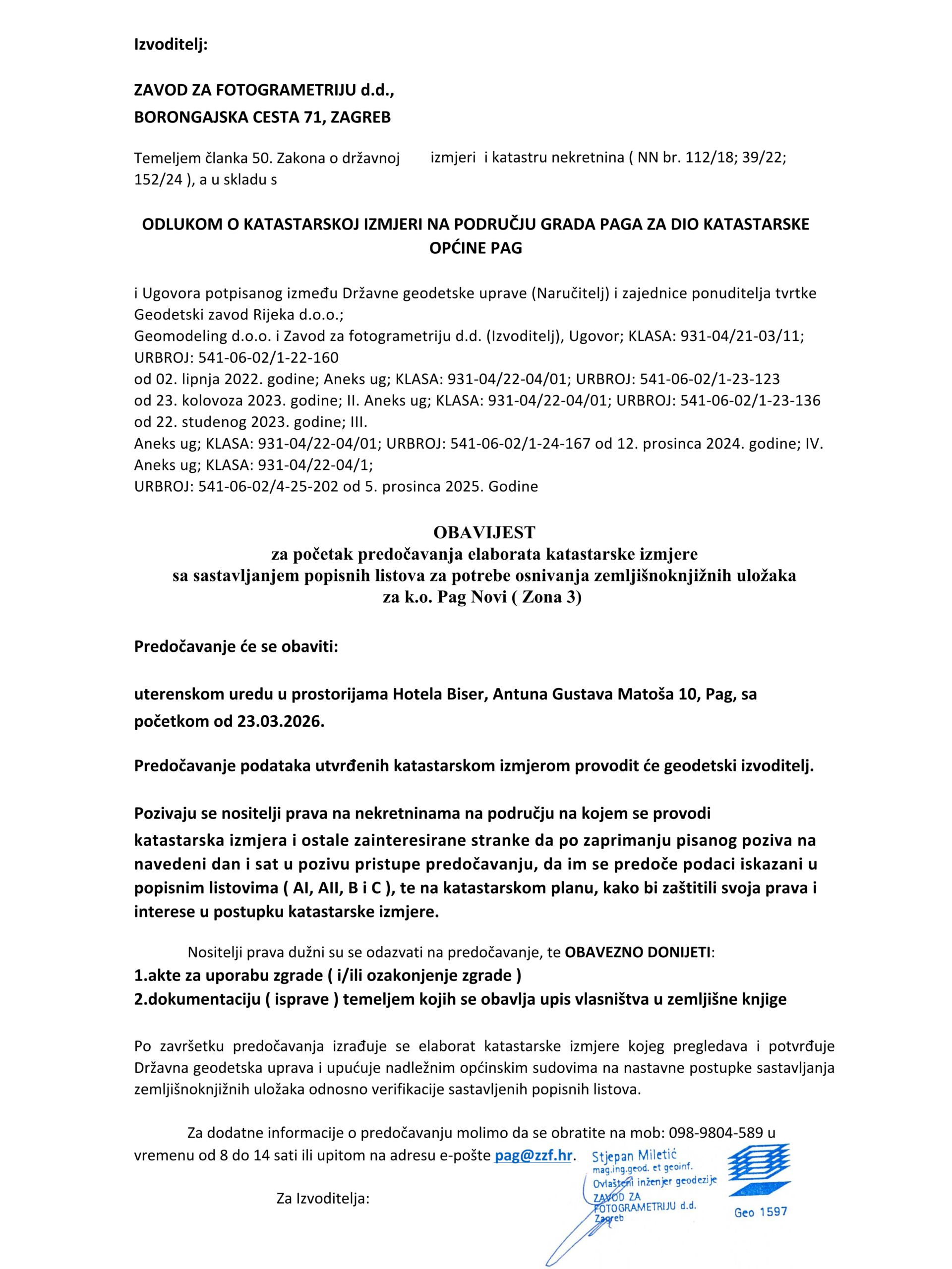Objavljen je javni poziv za početak predočavanja elaborata katastarske izmjere za k.o. Pag – detalje pogledajte u nastavku. Prethodni Objava ZZF na međunarodnoj sceni: prezentacija na Geo Week-u 2026 u Denveru (video)